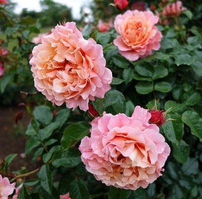 アプリコットとピンクが混ざる花弁が波打つ大輪花。非常に強健。
